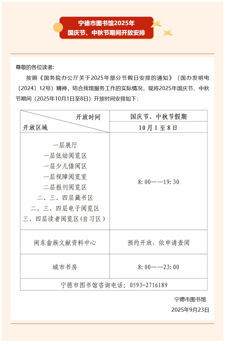 宁德市图书馆2025年国庆节、中秋节期间开放安排