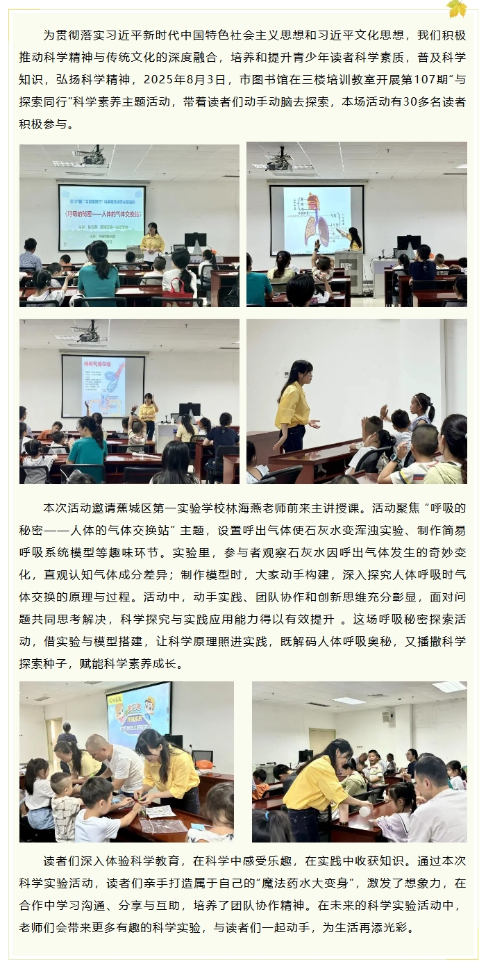 第107期“与探索同行”科学素养主题活动《呼吸的秘密——人体的气体交换站》成功举办