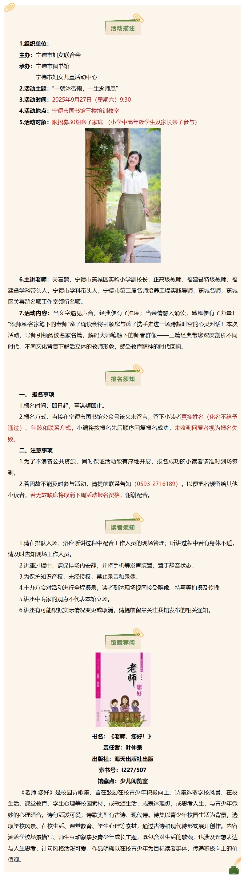 活动报名|“阅读暖童心 书香润家庭”第10期亲子诵读活动:“一朝沐杏雨,一生念师恩”